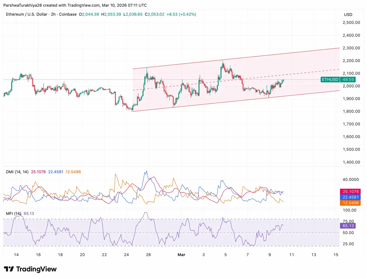 • Ethereum trades at $2,046, up 2.67%, holding inside an ascending channel as MFI climbs to 65.13 on the 2-hour chart.