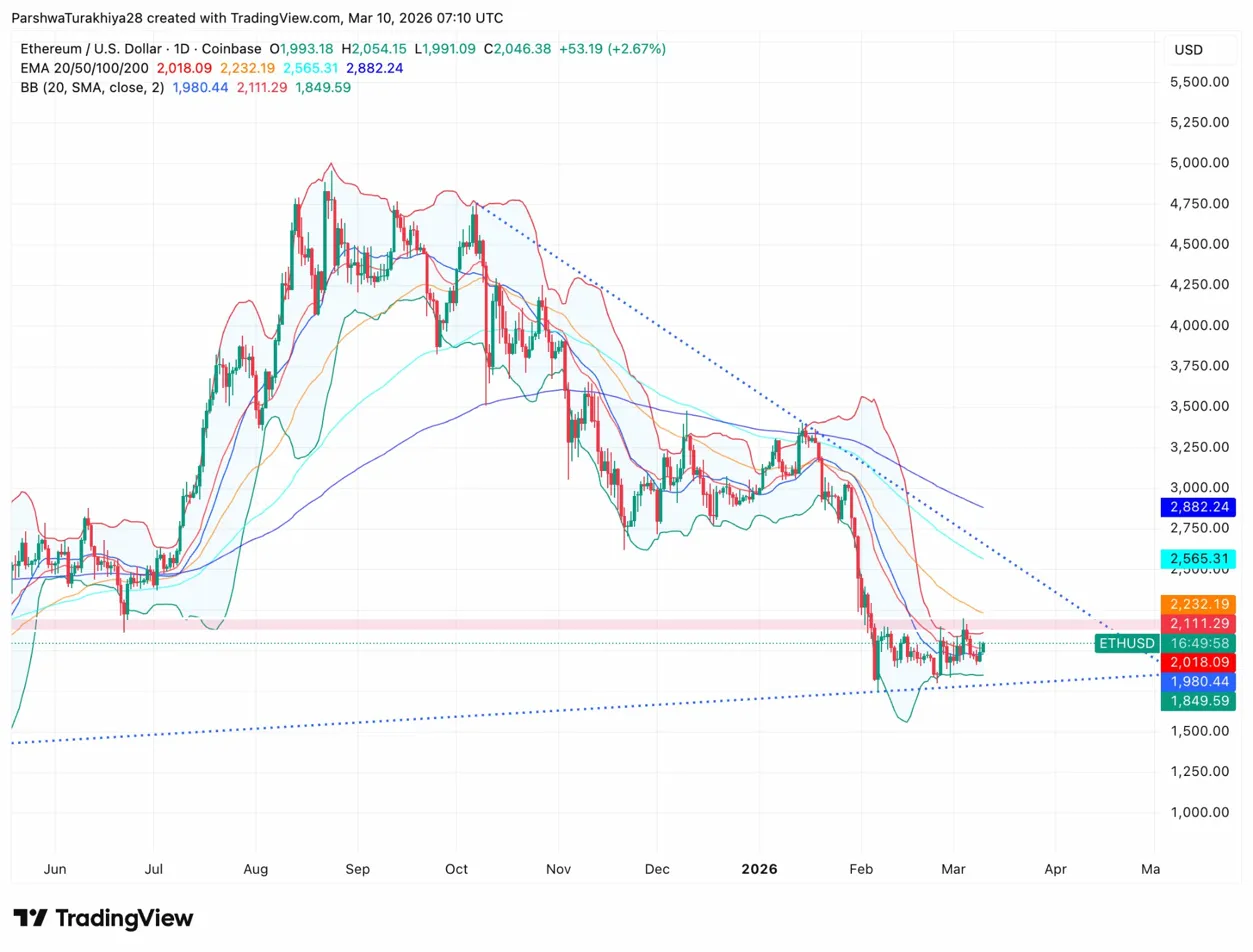 Ethereum peaked near $4,900 in August 2025 and has spent the months since carving a persistent downtrend, with price touching lows near $1,800 in late February before the current recovery began. The 20-day EMA at $2,018 is the first real resistance test above current price, sitting just overhead as bulls attempt to reclaim it on a daily close basis.