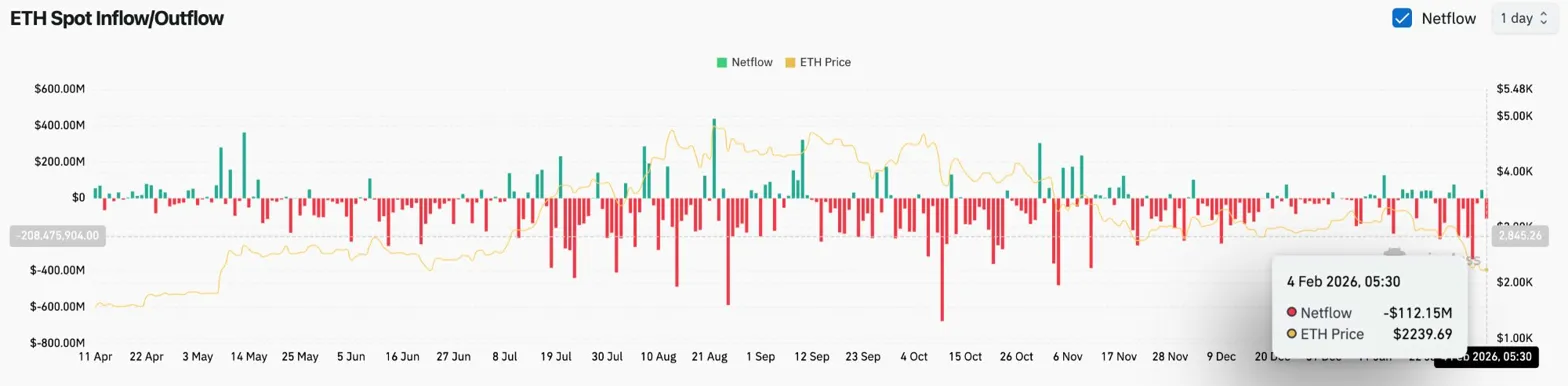 Despite the positive ETF flow, spot markets tell a different story. Coinglass data shows $112.15 million in net outflows on February 4, one of the larger distribution days of the past month.