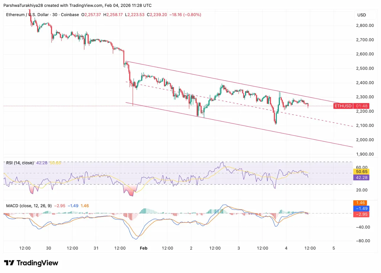 On the 30-minute chart, Ethereum trades within a descending channel that has guided price action since January 30. Channel resistance sits near $2,350, while support runs through the $2,100 zone.