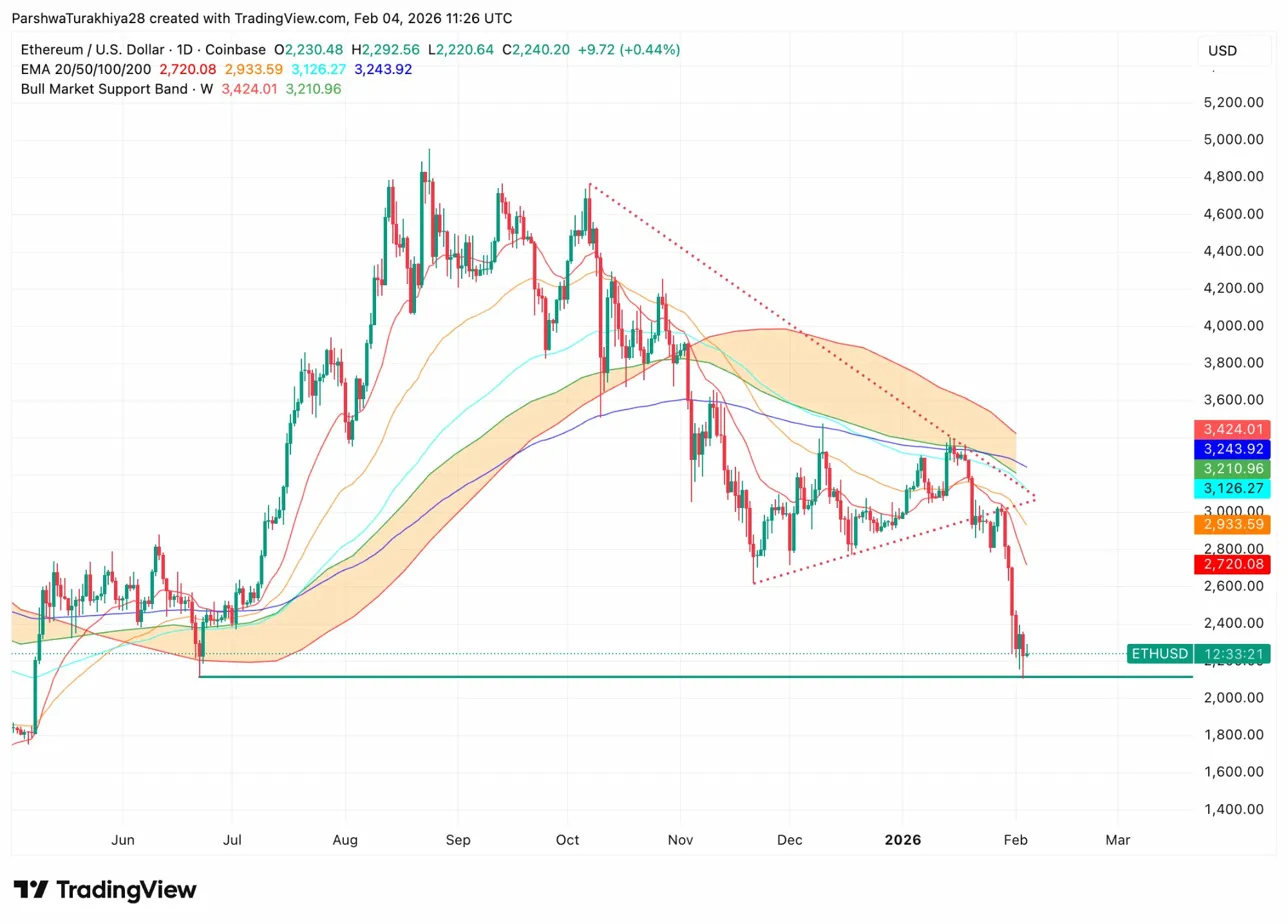 On the daily chart, Ethereum trades well below the bull market support band, which spans from $3,210 to $3,424. This band has historically separated bull markets from bear markets, and the decisive break below it confirms the bearish macro structure.