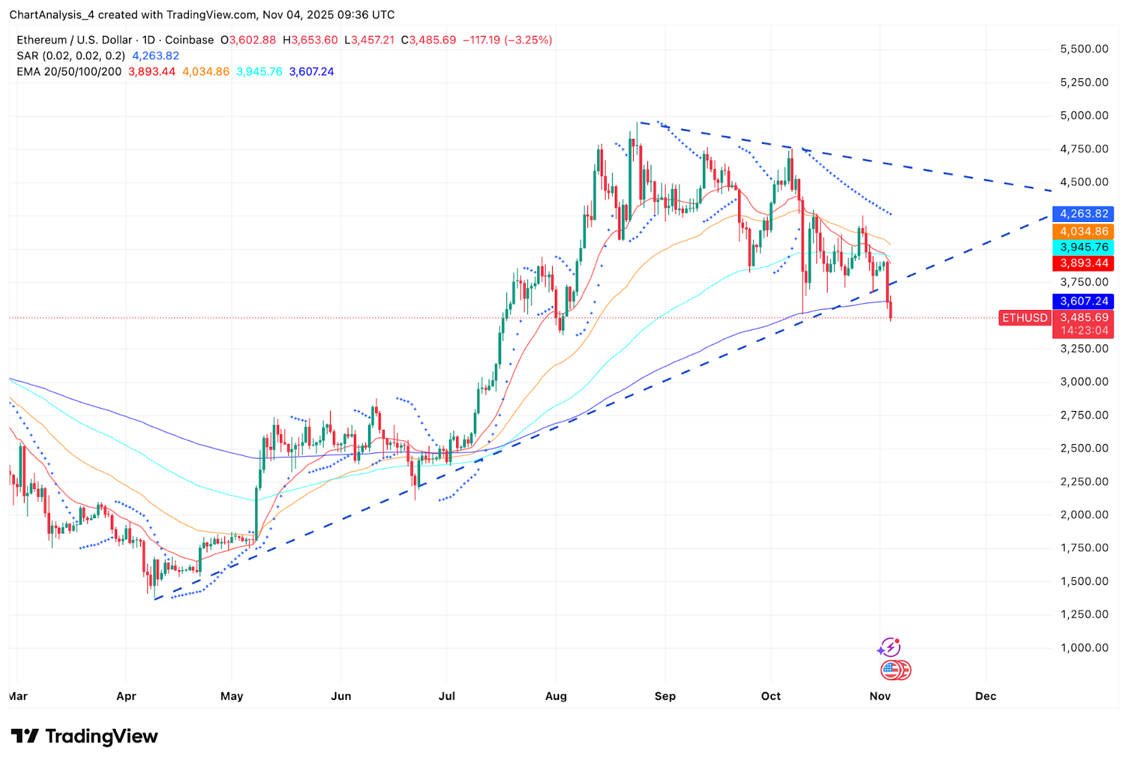 Ethereum price today sits below the 200 day EMA at $3,607, breaking trendline support for the first time since April. Sellers defended the EMA cluster at $3,893 to $4,034, where the 20 and 50 EMAs converge. That cluster has now turned into resistance.