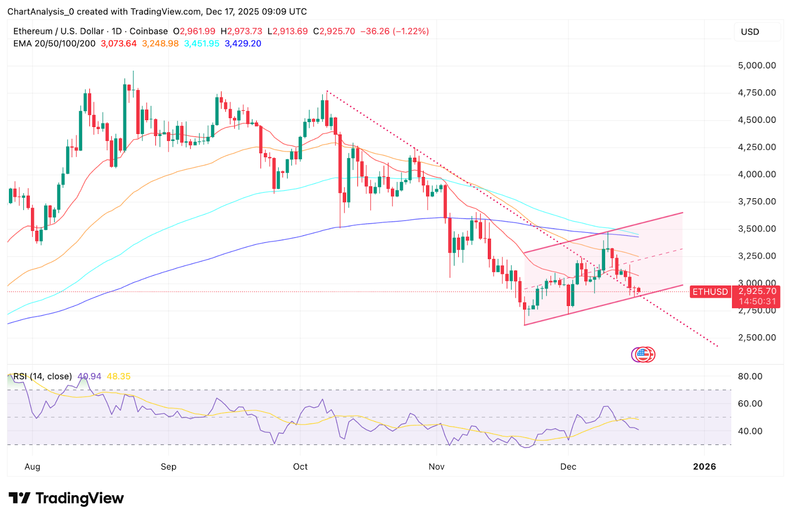 - Bullish case. A daily close above $3,074, followed by a reclaim of the 50-day EMA near $3,249, would signal improving momentum and open the path toward the $3,450 resistance zone.