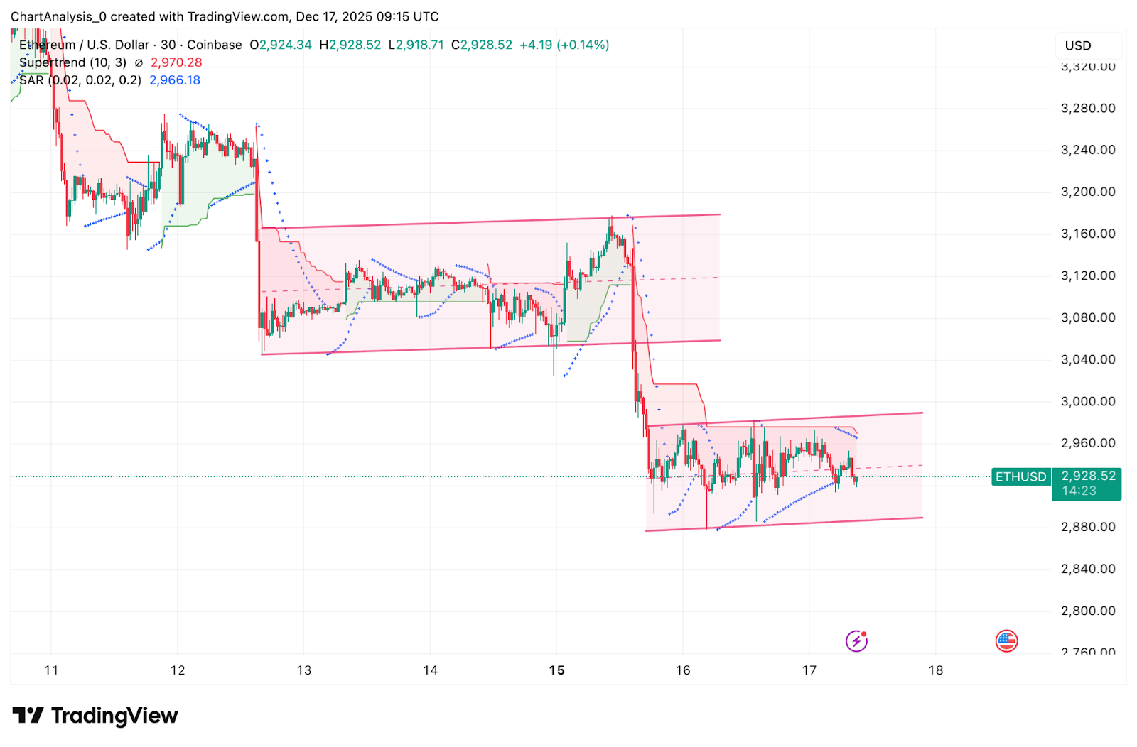 On the 30-minute chart, Ethereum is not trending. Price is consolidating after the sharp breakdown, trading inside a tight horizontal range between $2,880 and $2,980.