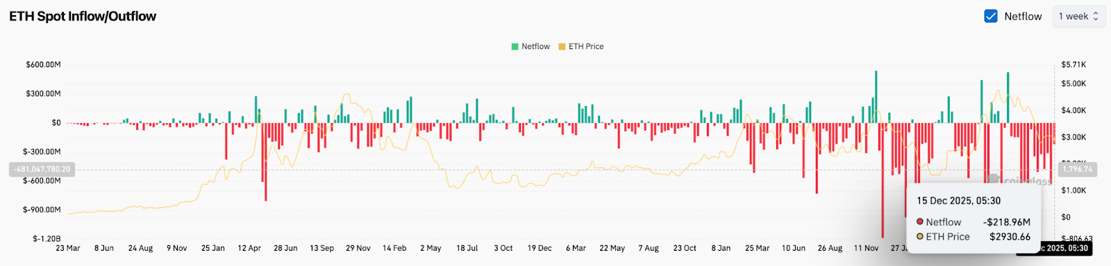 Spot flow data tells a similar story. Ethereum has seen repeated sessions of net exchange outflows turning negative, signaling distribution rather than accumulation.