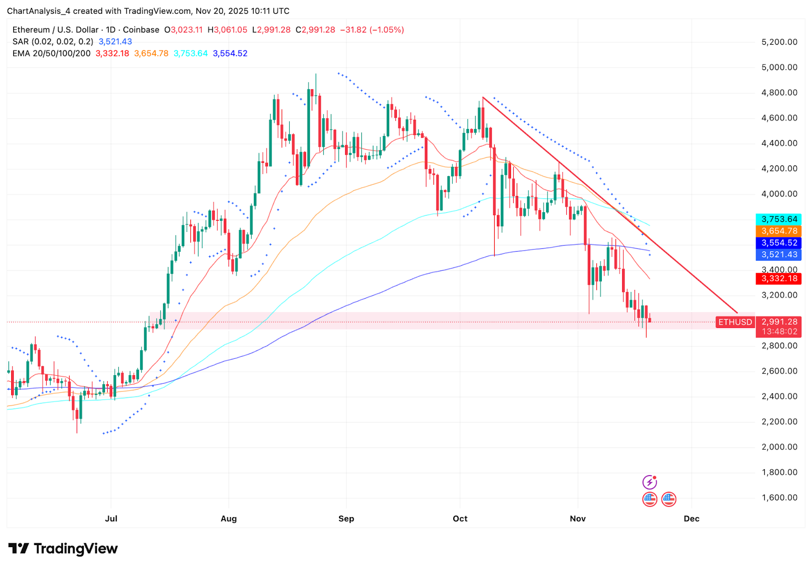 The daily chart shows ETH trading well below the descending trendline that connects the October and November swing highs. Every attempt to reclaim it has failed, including the latest retest near $3,250, where price was rejected cleanly.