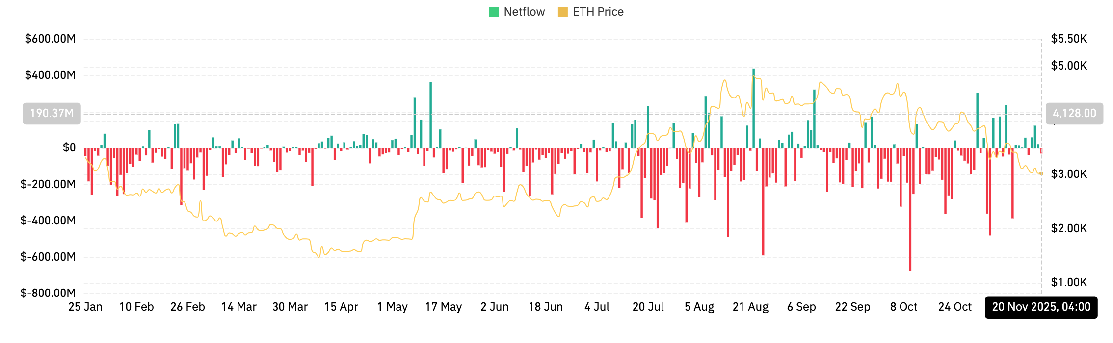 Coinglass data confirms the pressure. Ethereum recorded $35.38M in net spot outflows on November 20. This continues a pattern of persistent red bars that began in late September.
