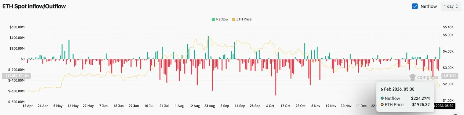 Despite the insider selling, Coinglass data shows $224.27 million in spot inflows on February 6, marking a dramatic reversal from the outflows that dominated the past two weeks. This represents one of the largest single-day inflow readings in recent months.