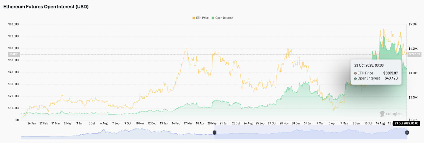 Ethereum’s futures market reflects growing speculative interest. Open interest climbed from under $10 billion in February to more than $43 billion by October 23, 2025.