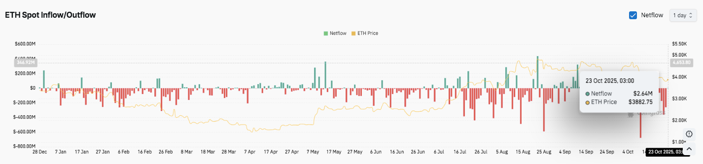 Ethereum’s on-chain data shows declining outflows since July, suggesting reduced selling pressure. October’s modest inflow of $2.64 million indicates cooling bearish momentum as investors monitor liquidity conditions. Historically, extended outflow periods have aligned with accumulation and price recoveries, while inflows signal possible corrections.