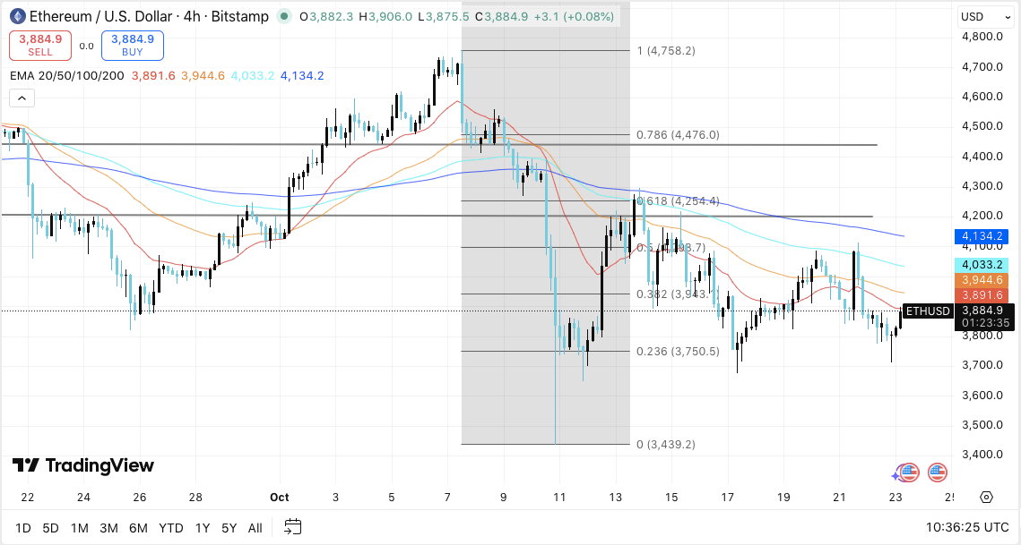 The 4-hour chart shows ETH struggling beneath key EMAs 20, 50, 100, and 200 clustered between $3,890 and $4,134. This alignment highlights persistent bearish pressure. Immediate resistance sits at $3,944, followed by $4,033 and $4,134. A clean breakout above the $4,254 Fibonacci level could restore bullish momentum. In that case, potential upside targets include $4,476 and $4,758.