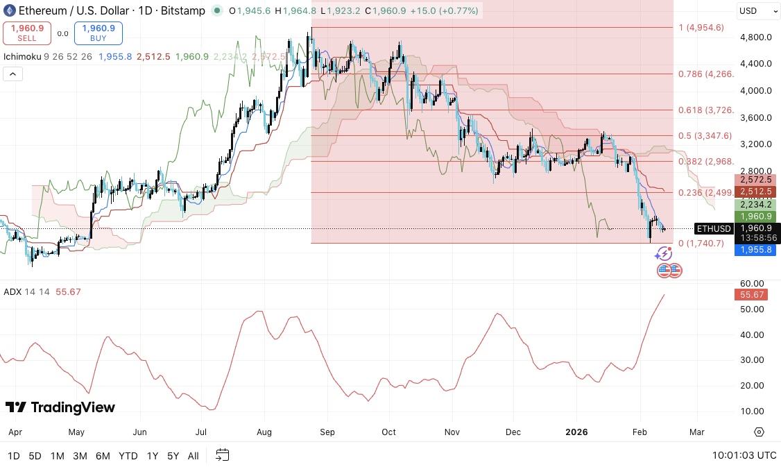The technical structure shows Ethereum trading firmly within a downward channel, reinforced by rising ADX near 55. This setup signals strong trend conditions rather than consolidation. Until buyers reclaim the $2,234–$2,512 range, rallies may face selling pressure.