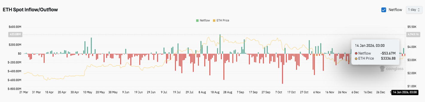 Spot flow data tells a more cautious story. Ethereum experienced extended net outflows, signaling distribution pressure during pullbacks. However, outflows narrowed recently near the $3,300 zone.