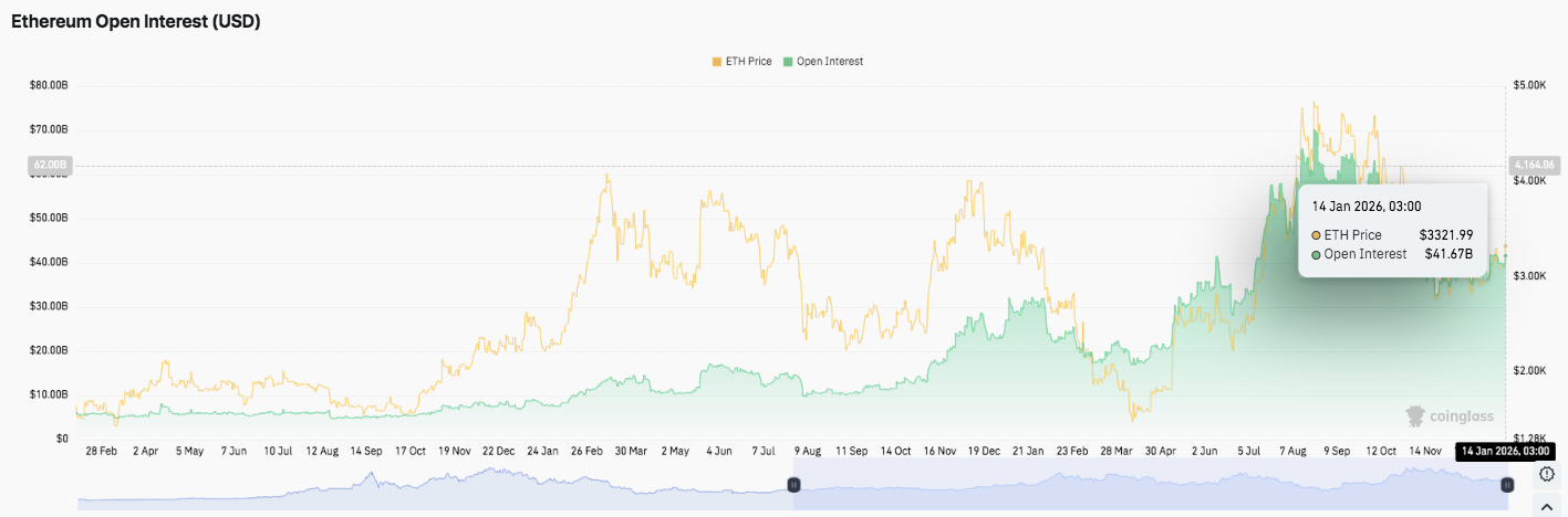 Derivatives data adds complexity to the outlook. Ethereum open interest expanded sharply during recent price advances, surpassing $40 billion. This trend reflects rising leveraged participation rather than pure spot accumulation.