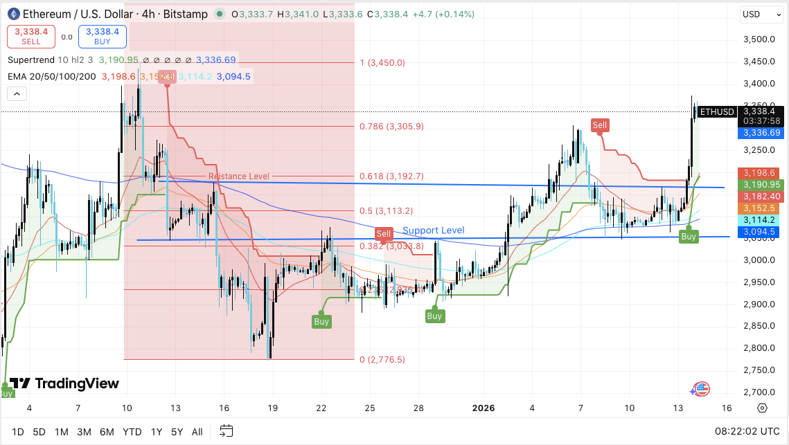 Ethereum extended its short-term recovery as prices stabilized near the $3,335 level during the latest 4-hour session. Market data shows ETH breaking out of a multi-week consolidation, shifting sentiment toward upside continuation. The move followed several failed attempts earlier this year, which kept price action capped below the $3,250 area.
