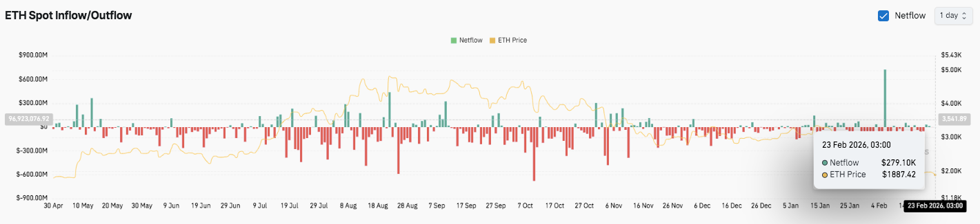 From late November onward, flows began stabilizing. February reflects mixed activity, with modest inflows and one large spike above $600 million. The latest netflow reading near $279,000 suggests balanced positioning.
