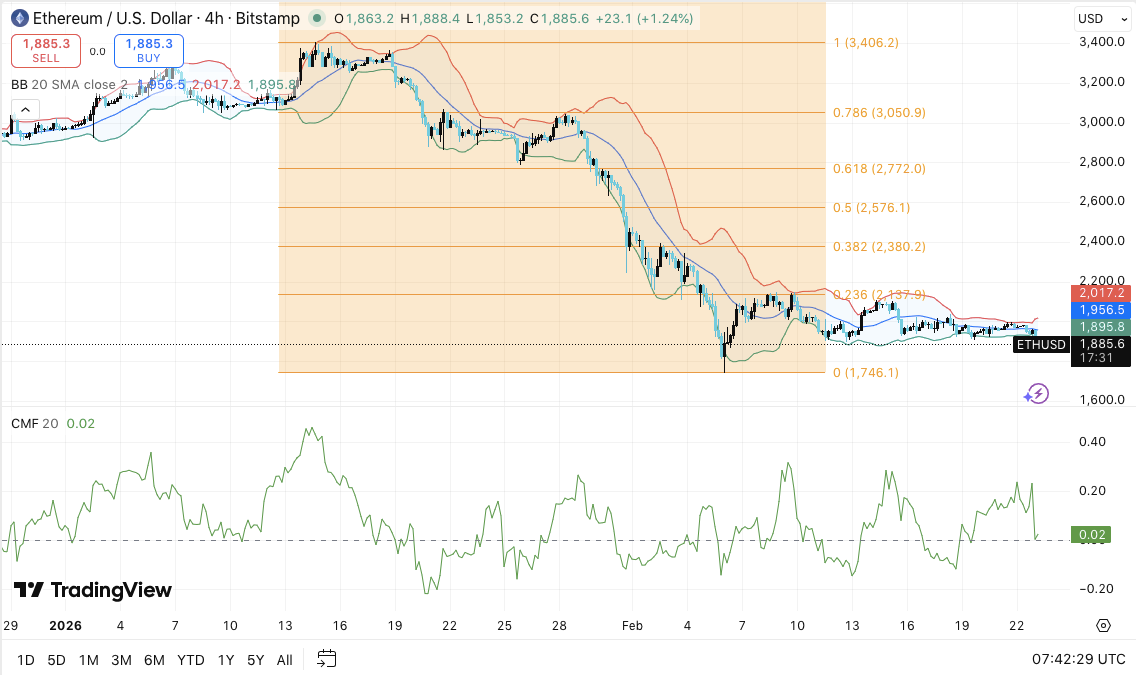 ETH rebounded from the $1,746 swing low, which aligns with the 0.0 Fibonacci level. Since then, price has hovered between $1,885 and $1,960.