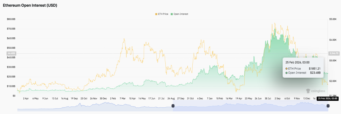 Ethereum open interest shows a clear expansion followed by a sharp contraction into late February. During the prior rally, open interest climbed steadily as price advanced toward local highs. Significantly, the mid-year breakout pushed open interest above $60 billion, reflecting heavy leverage.