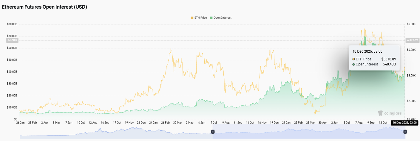 Ethereum futures open interest shows a strong rise through 2025 as traders increase participation. Consequently, open interest climbed above $40 billion by December 10, showing higher conviction across leveraged markets.
