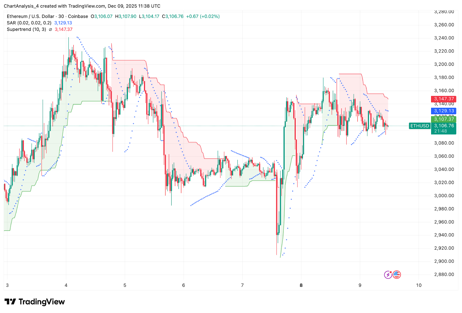 | Momentum (SAR) | Bearish | $3,147 resistance |