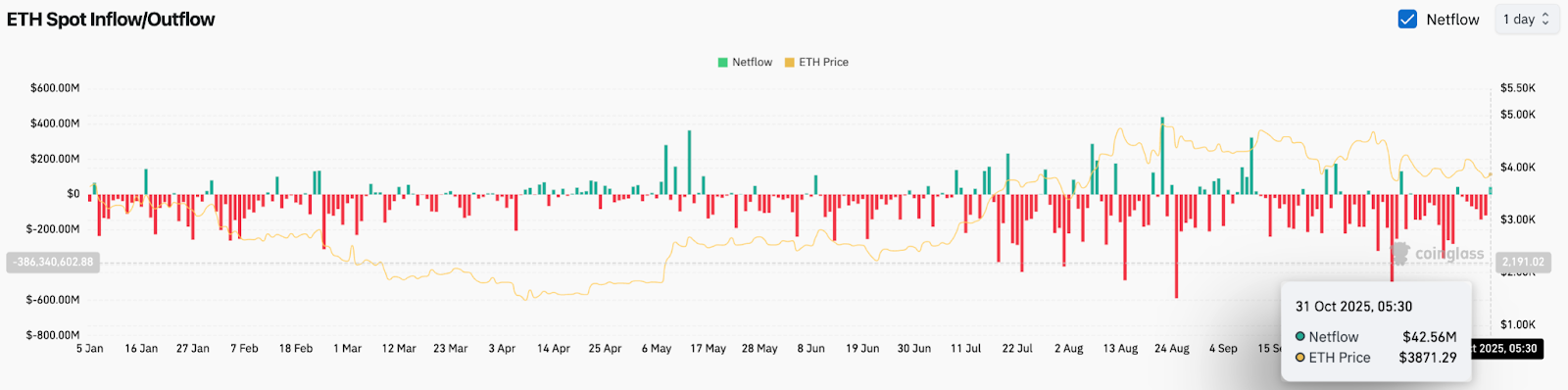 CoinGlass data confirms deepening spot net outflows totaling $386 million this week, with only limited offsetting inflows. The consistent red bars indicate sustained selling from large holders as price fluctuates around the ascending trendline near $3,600.