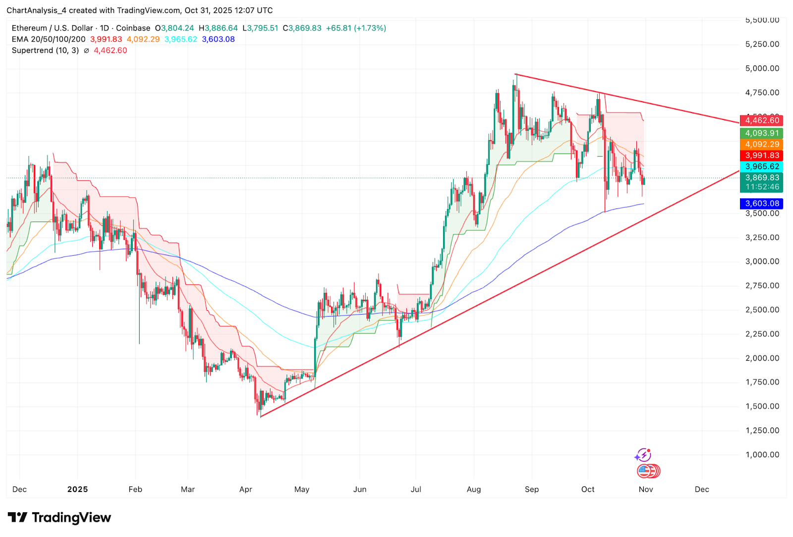 Technically, Ethereum trades inside a large symmetrical triangle pattern stretching back to April. The upper boundary aligns near $4,460, while the lower ascending trendline provides strong support around $3,600.