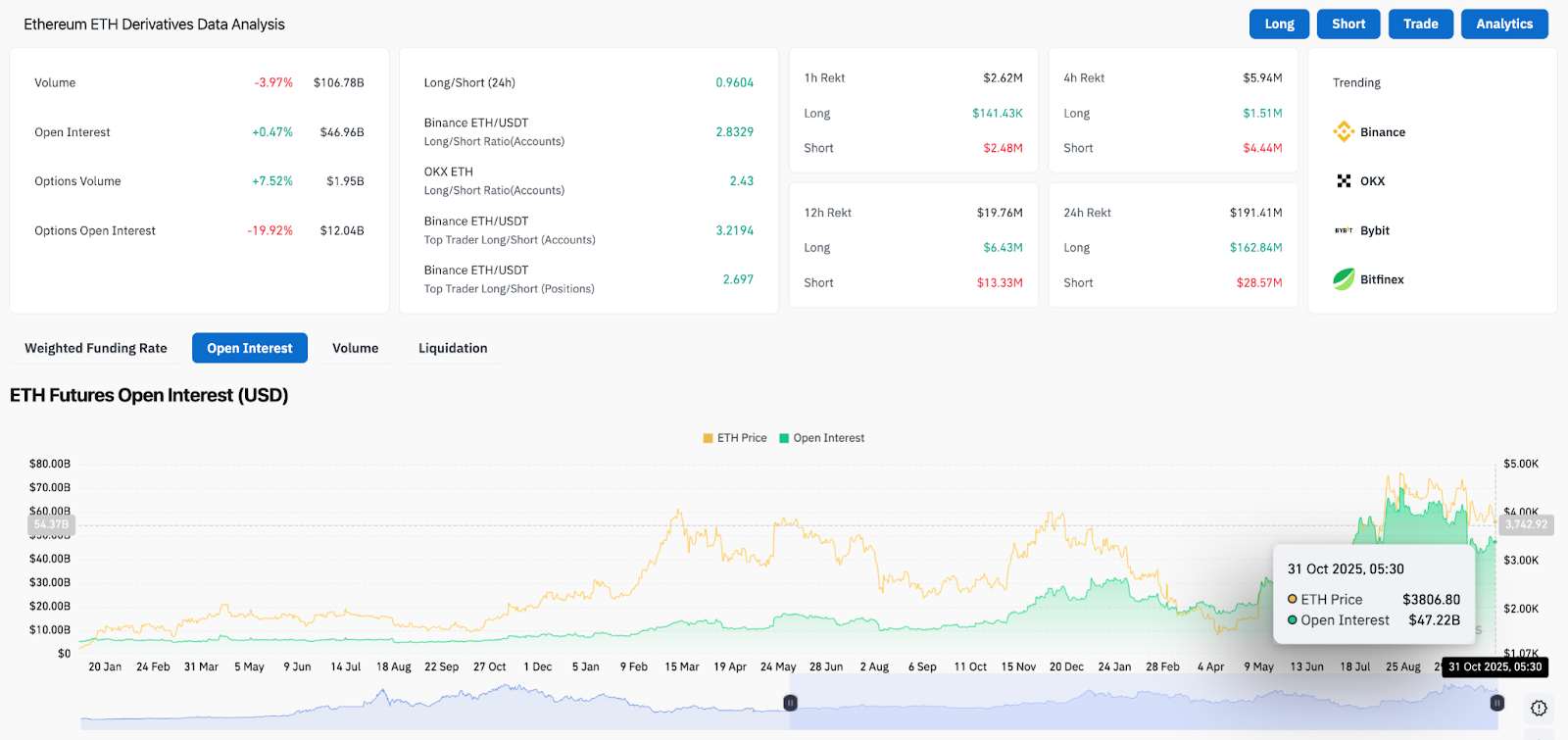 In derivatives markets, Ethereum’s open interest has climbed to $47.2 billion, up 0.47% on the day, reflecting that traders remain engaged despite spot selling. Long/short ratios on Binance and OKX sit above 2.6, suggesting leverage is skewed toward the long side.