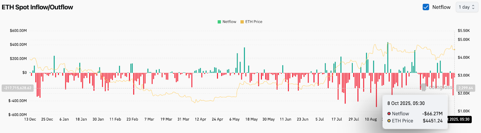 According to Coinglass, Ethereum recorded $66 million in net outflows on October 8, indicating mild profit-taking after last week’s rally. While short-term outflows often cool overheated price action, persistent weakness in exchange balances has historically preceded mid-cycle consolidations.