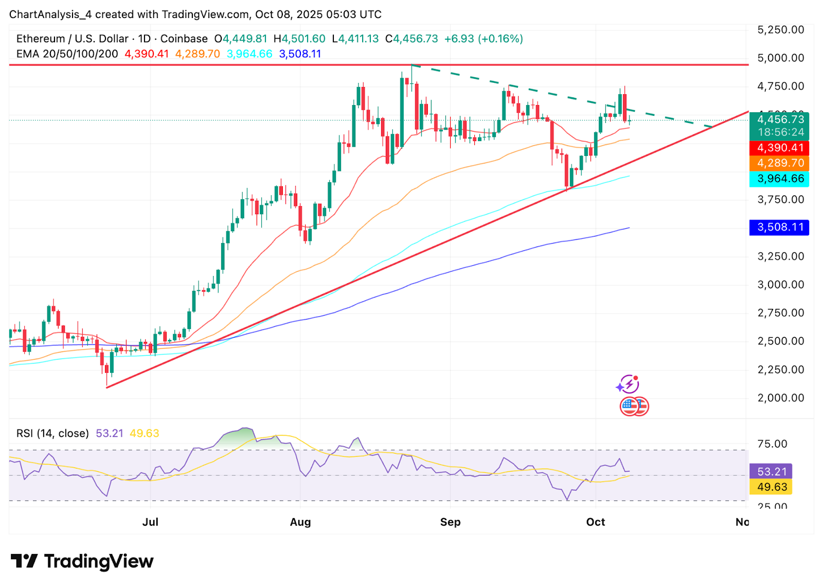 Ethereum (CRYPTO: ETH) price today is trading near $4,456, consolidating just below a critical descending trendline that has capped upside attempts since August. The market is holding above its short-term supports, with buyers defending the $4,390–$4,290 zone where the 20-day and 50-day EMAs converge.