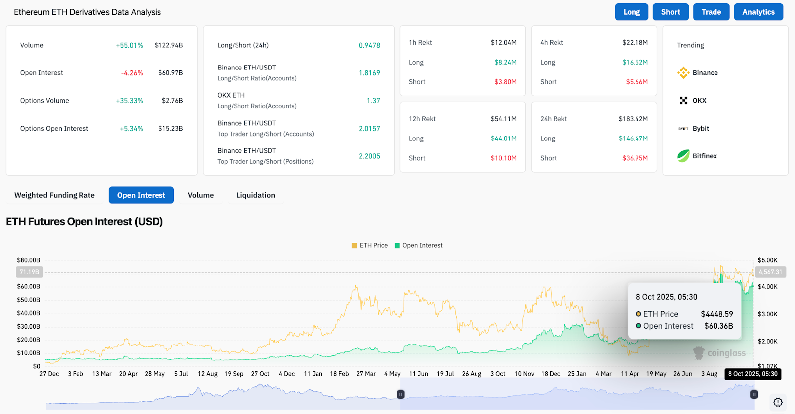 Derivatives data shows open interest at $60.9 billion, down 4% on the day, while options open interest climbed to $15.2 billion. The shift points to traders reducing leveraged positions but increasing exposure through hedged strategies.