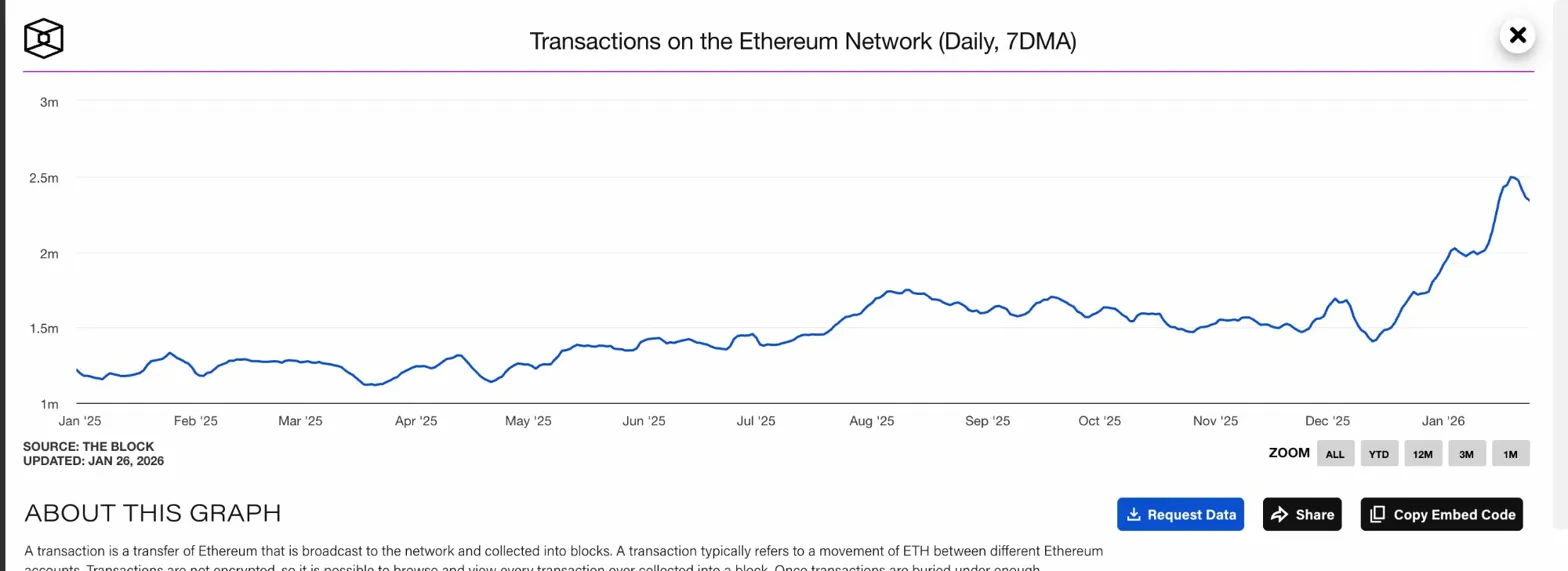 On-chain data reveals a fundamental disconnect from price. According to The Block, Ethereum’s 7-day moving average of daily transactions reached 2.34 million on January 24, which is one of the highest level in the network’s history.