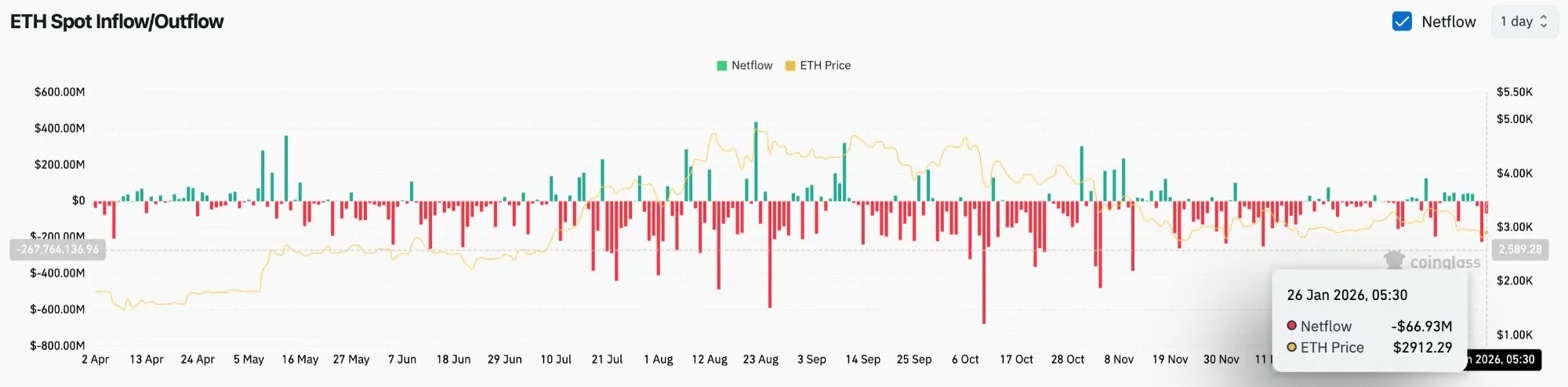 Exchange flow data confirms the bullish fundamental picture. Coinglass recorded $66.93 million in net outflows on January 26, meaning coins are moving off exchanges into private wallets at an aggressive pace.