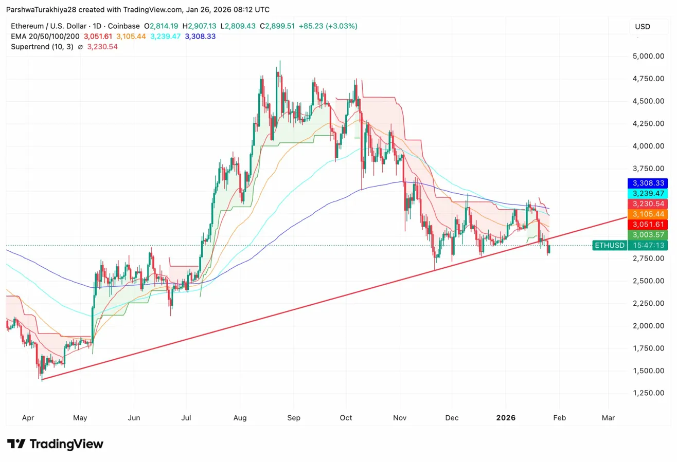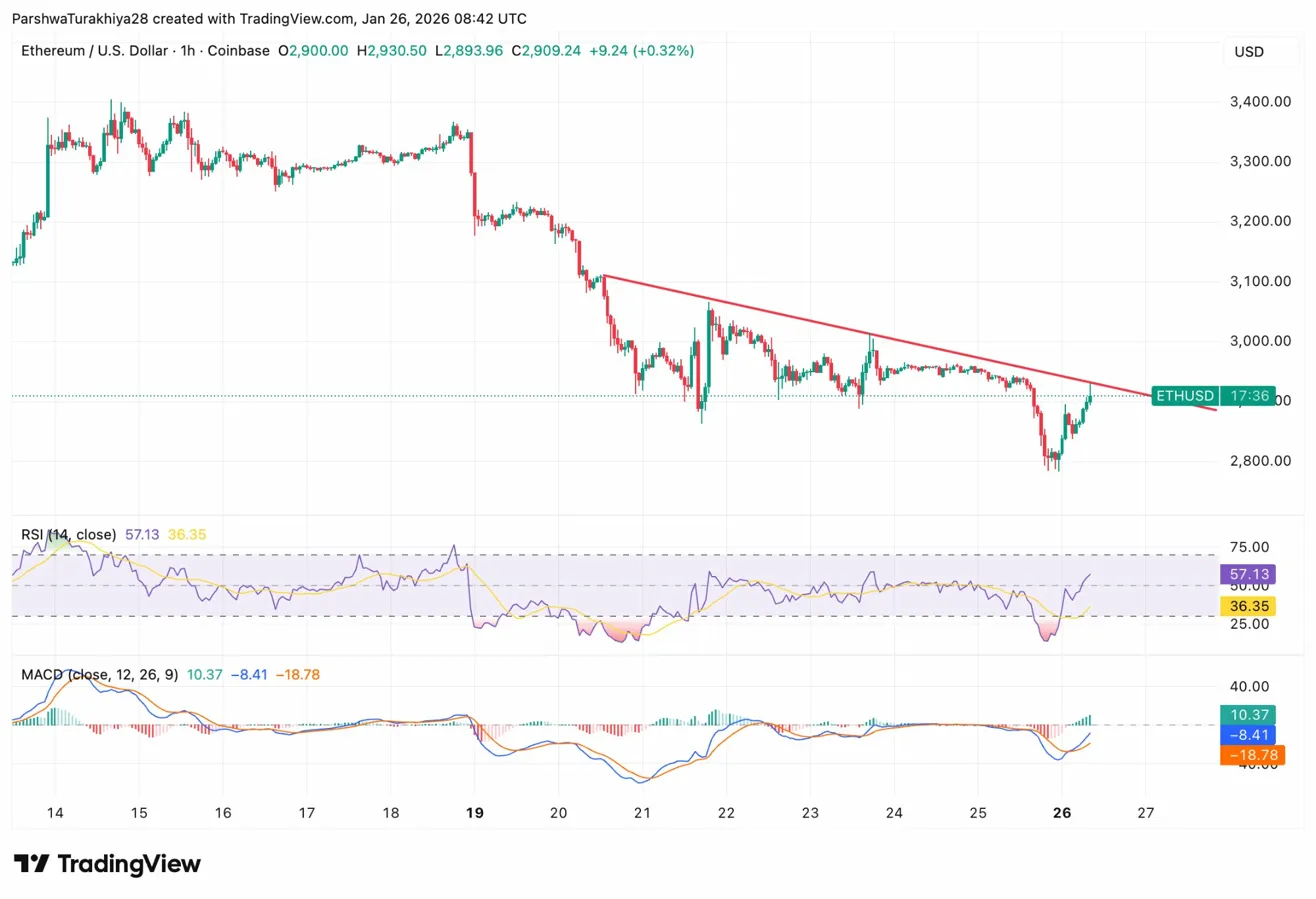 Shorter timeframes show improving conditions. On the hourly chart, ETH has bounced from $2,800 lows and broken above a descending trendline that capped rallies since January 19.