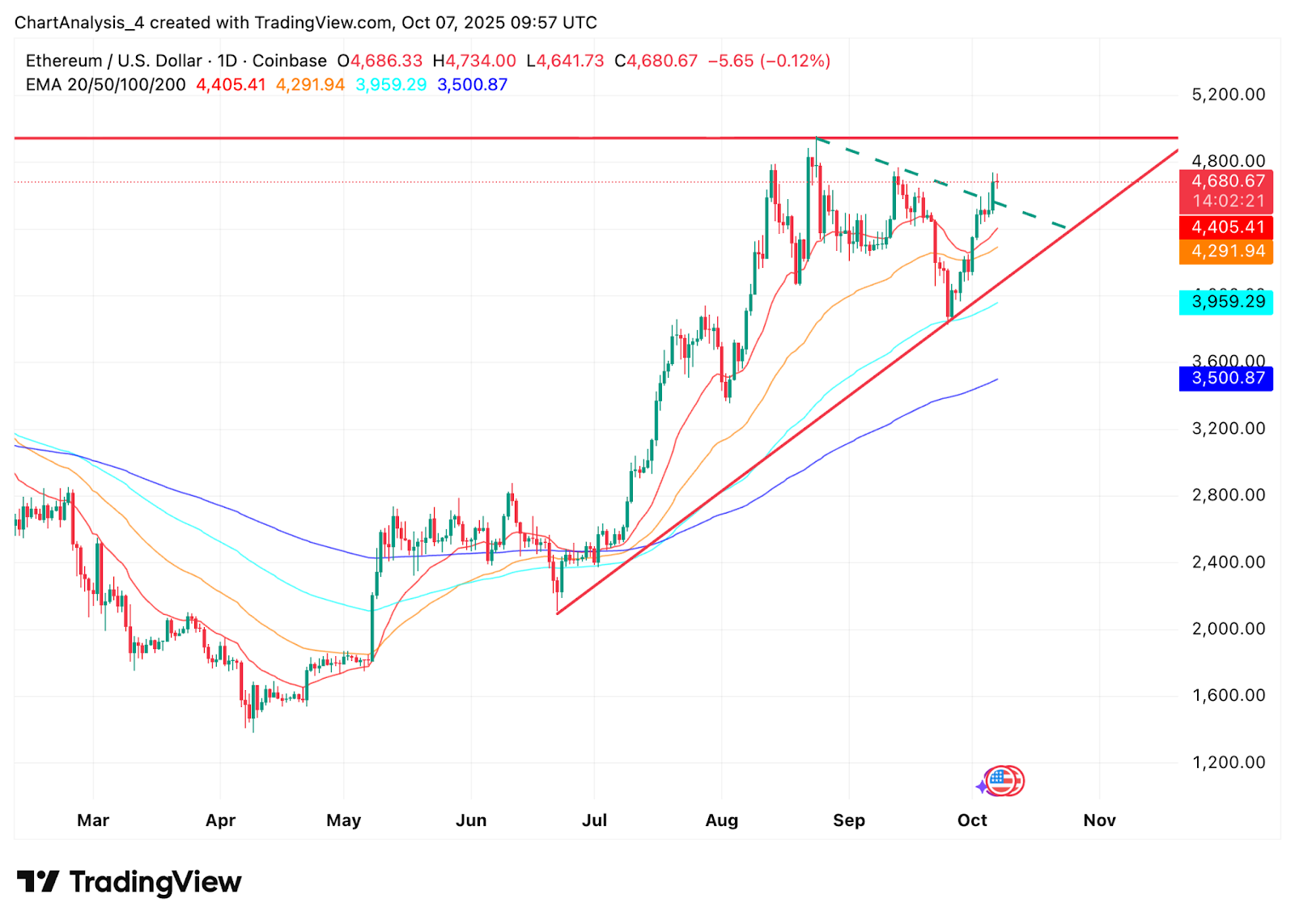 The daily chart shows Ethereum pressing against a descending triangle breakout zone near $4,700–$4,750, which has capped upside momentum since mid-August. A successful breakout above this area would confirm continuation of the uptrend within the broader ascending channel that began in May.