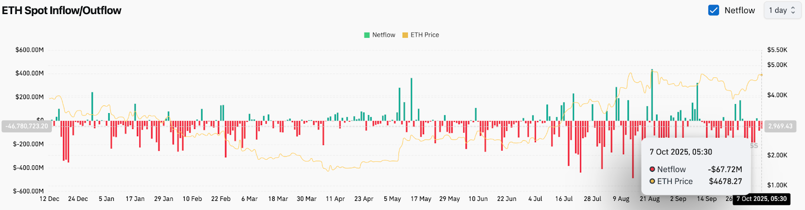 Exchange data shows a $67.7 million net outflow on October 7, continuing a multi-day pattern of withdrawals from centralized platforms. Persistent outflows typically suggest accumulation by long-term holders and validators, reinforcing the current demand narrative.