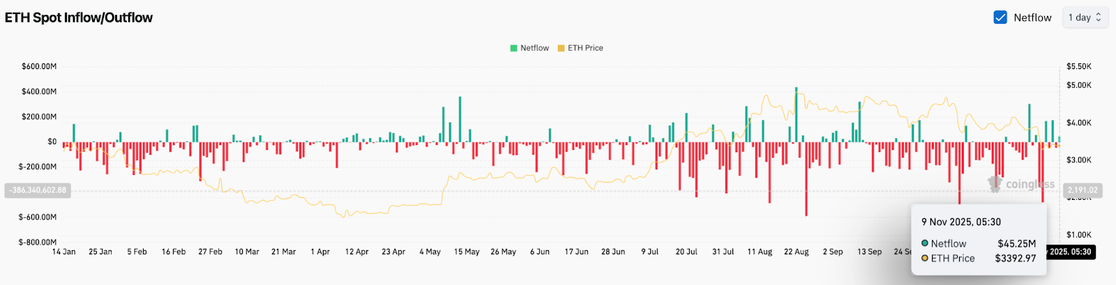 According to CoinGlass, Ethereum recorded repeated net outflows in recent sessions, including heavy distribution through late October and early November. While the latest session shows a small $45.25 million net inflow, it follows multiple deep outflow days that pushed liquidity off exchanges and triggered the breakdown from trend support.