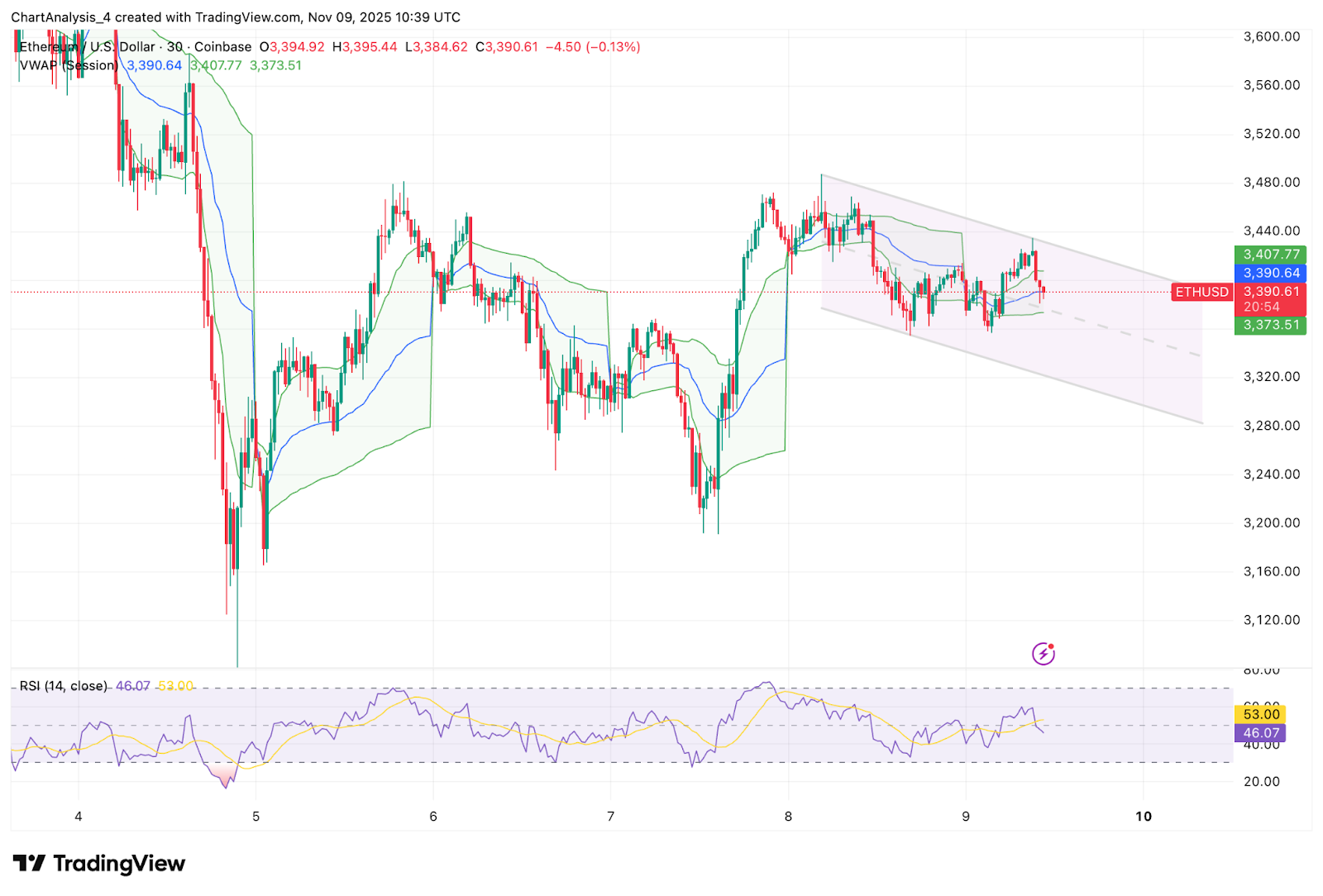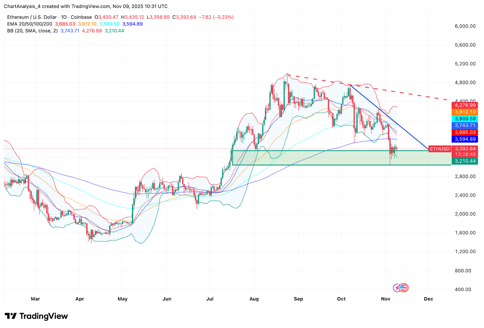 - Ethereum trades near $3,392, sitting on the critical $3,320–$3,210 demand zone as sellers reject every bounce from trendline resistance.