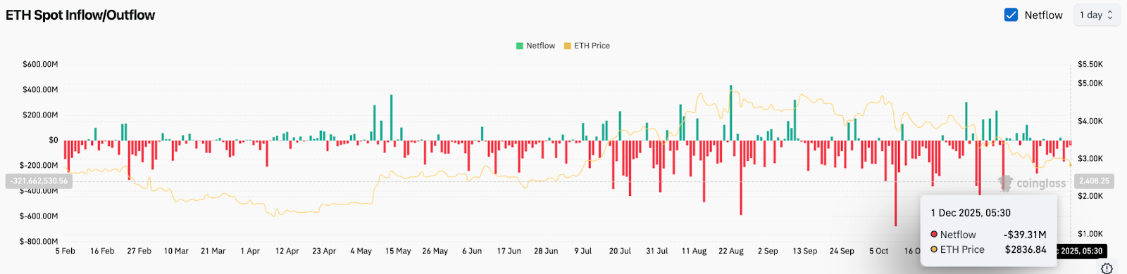 Coinglass data shows $39.31 million in outflows on December 1. While lighter than Bitcoin’s broad distribution, the trend reflects consistent selling pressure across ETH markets through most of November.