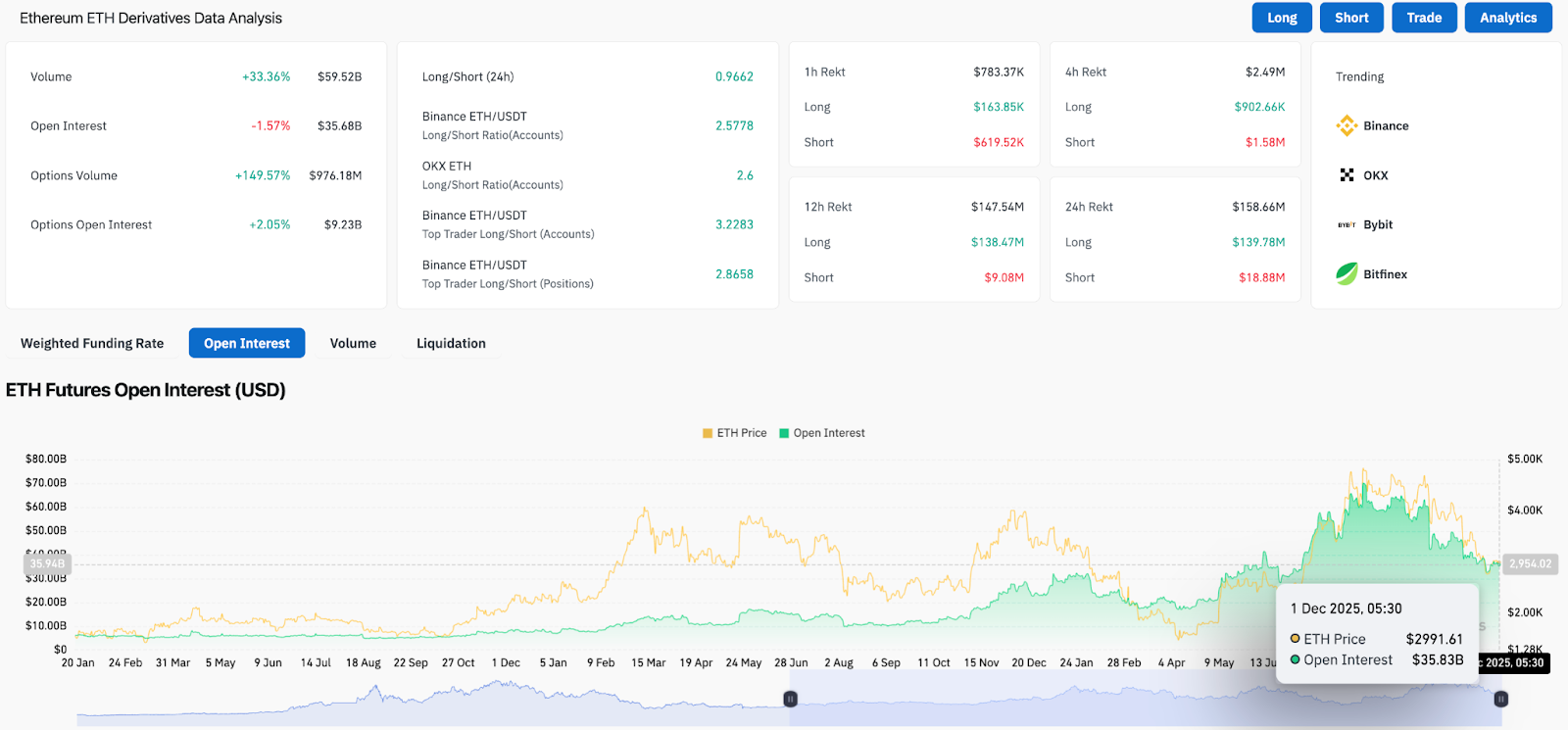 Ethereum derivatives data shows open interest down 1.57 percent to $35.68 billion, confirming that leveraged exposure is easing. The move is small but meaningful because it follows a multi-day pattern of elevated long positioning.