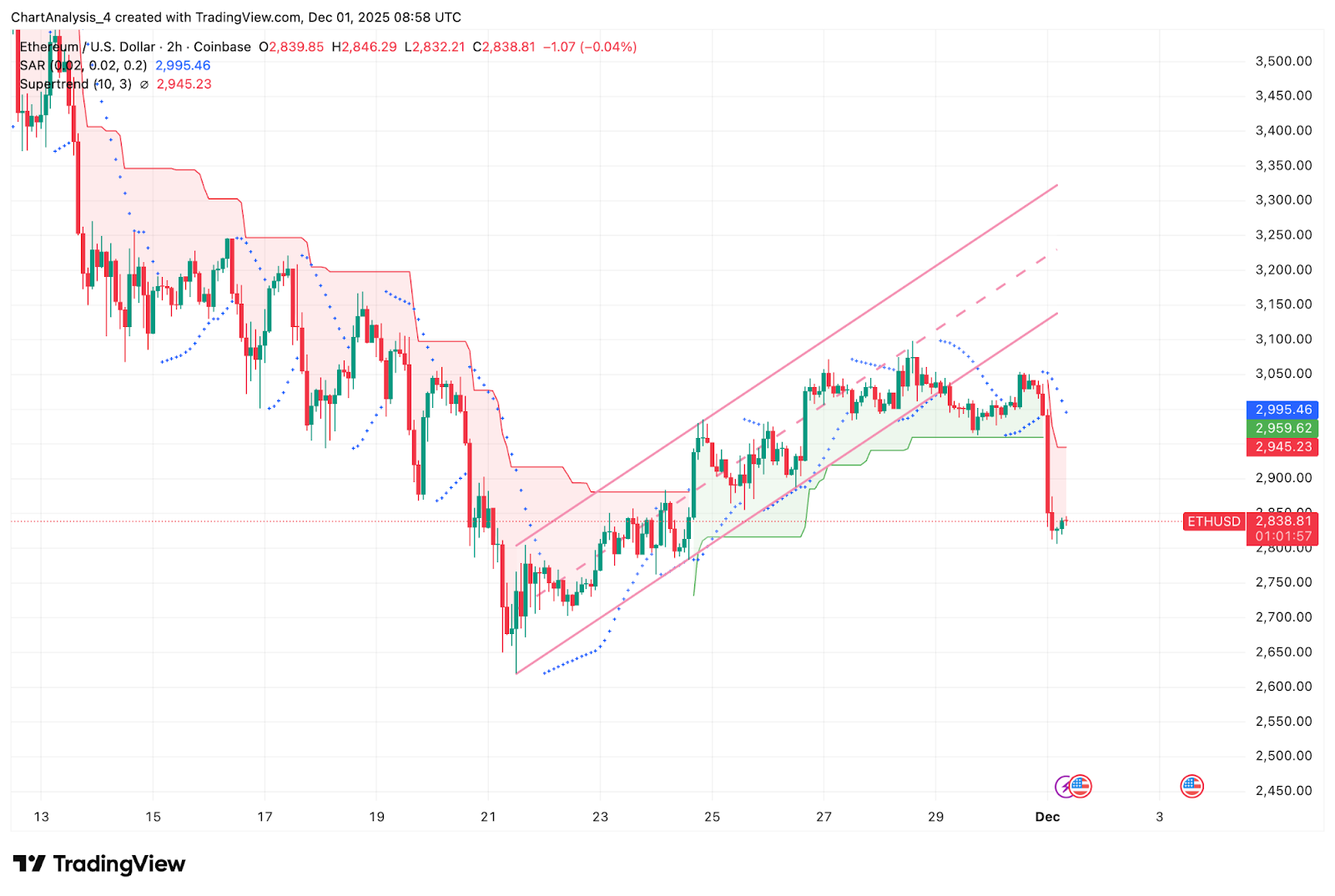 On the two hour chart, ETH exited its short-lived rising channel with a decisive breakdown. The drop sliced through the Supertrend support at $2,945 and triggered follow-through selling that carried price toward the $2,830 area.