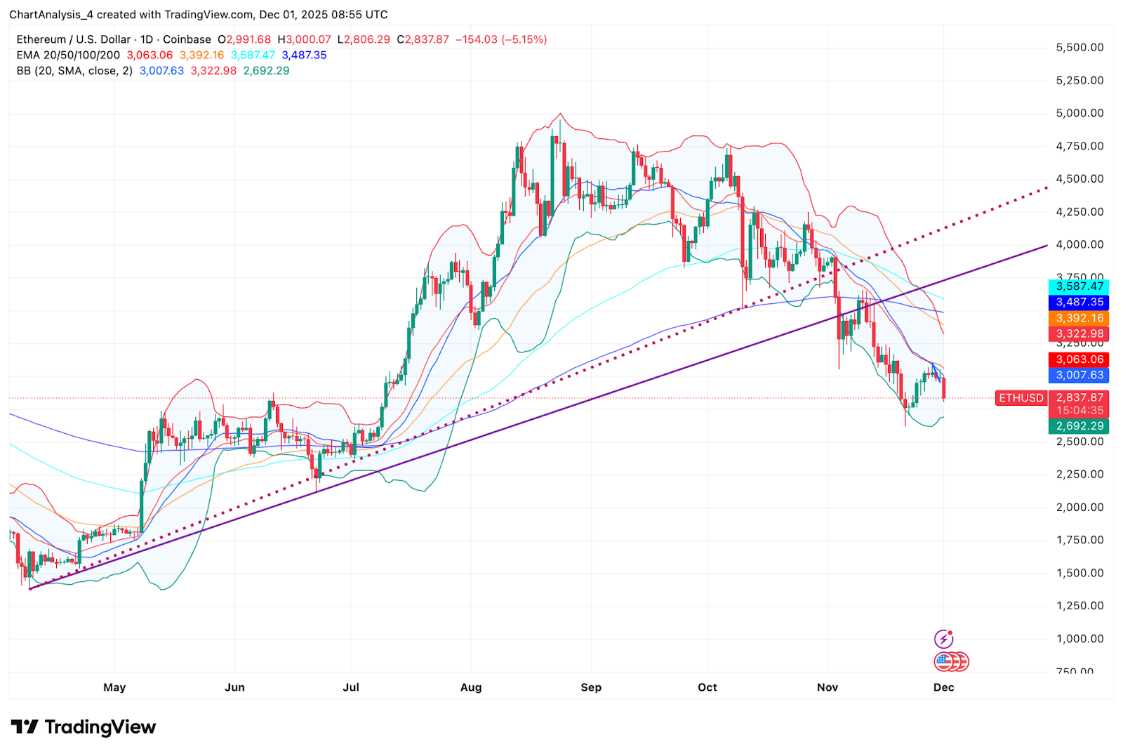Ethereum must reclaim the $3,063 level to regain trend control. Falling below $2,700 turns the move into a deeper correction heading into December.