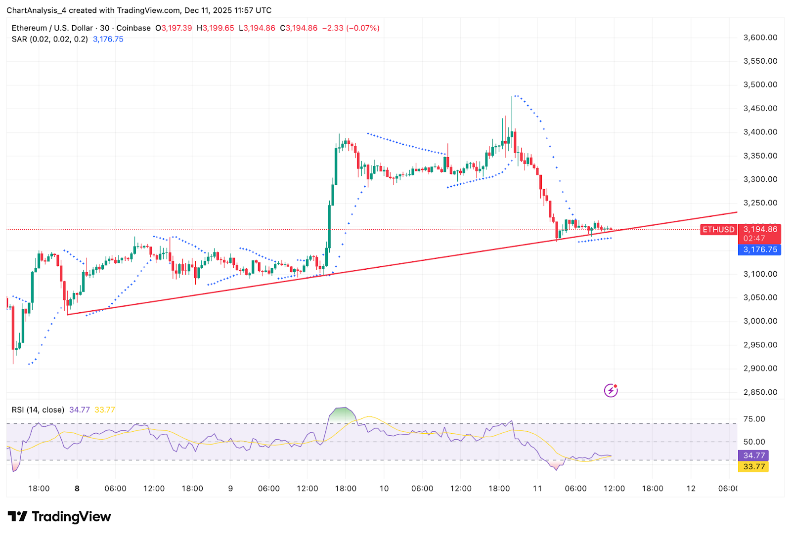 If ETH fails to bounce cleanly from the trendline, the next test will be the $3,175 area. A break below that level could accelerate selling toward $3,084.