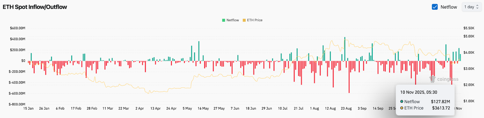 For most of October and early November, Ethereum faced net spot outflows, which signaled distribution. That changed today.