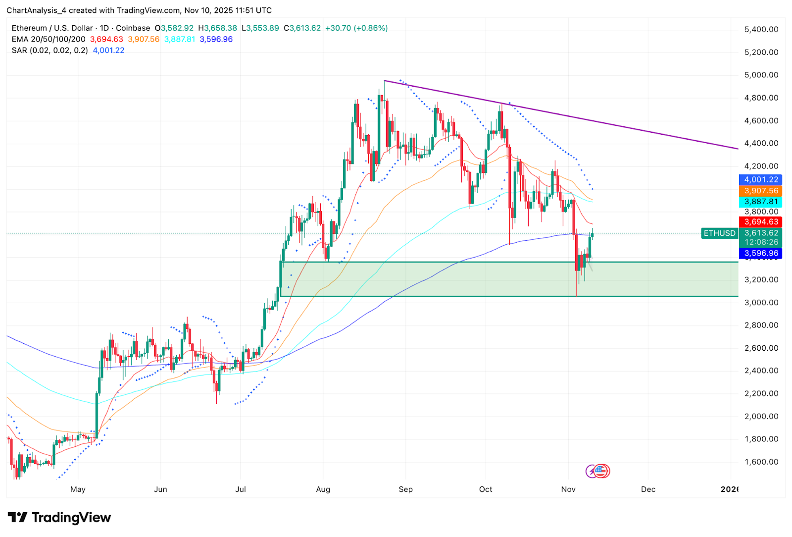 - Ethereum price today trades near $3,613, holding above the key demand zone and reclaiming momentum.