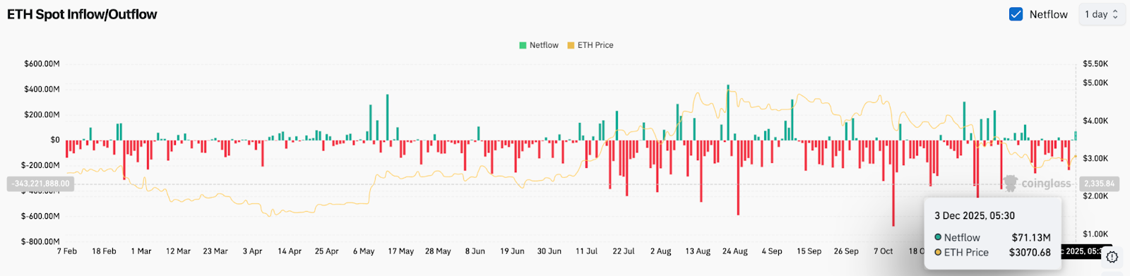 Spot flow data shows $71 million in net inflows on December 3. This marks a shift from the heavy distribution that dominated much of November and coincides with the break above resistance. Positive flows during a breakout historically improve the probability of continuation, particularly when inflows are sustained over multiple sessions.