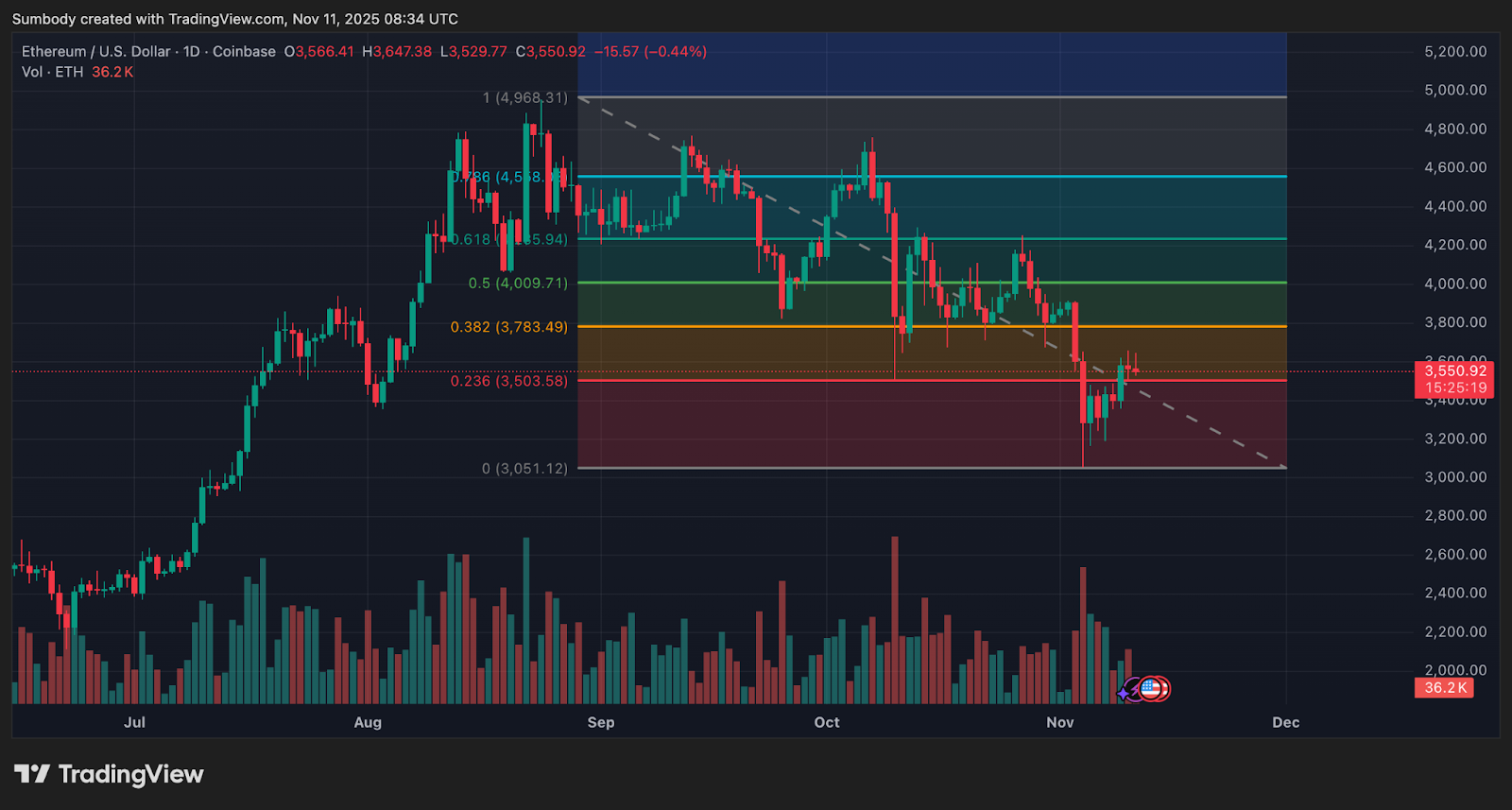 Despite the Ethereum whale selloff spotted by Martinez, the flagship altcoin mounted a recovery, bouncing off support close to the $3,000 psychological level. Ethereum has gained nearly 20% in the past seven days, reclaiming the $3,354 level to trade for $3,550 at the time of writing.