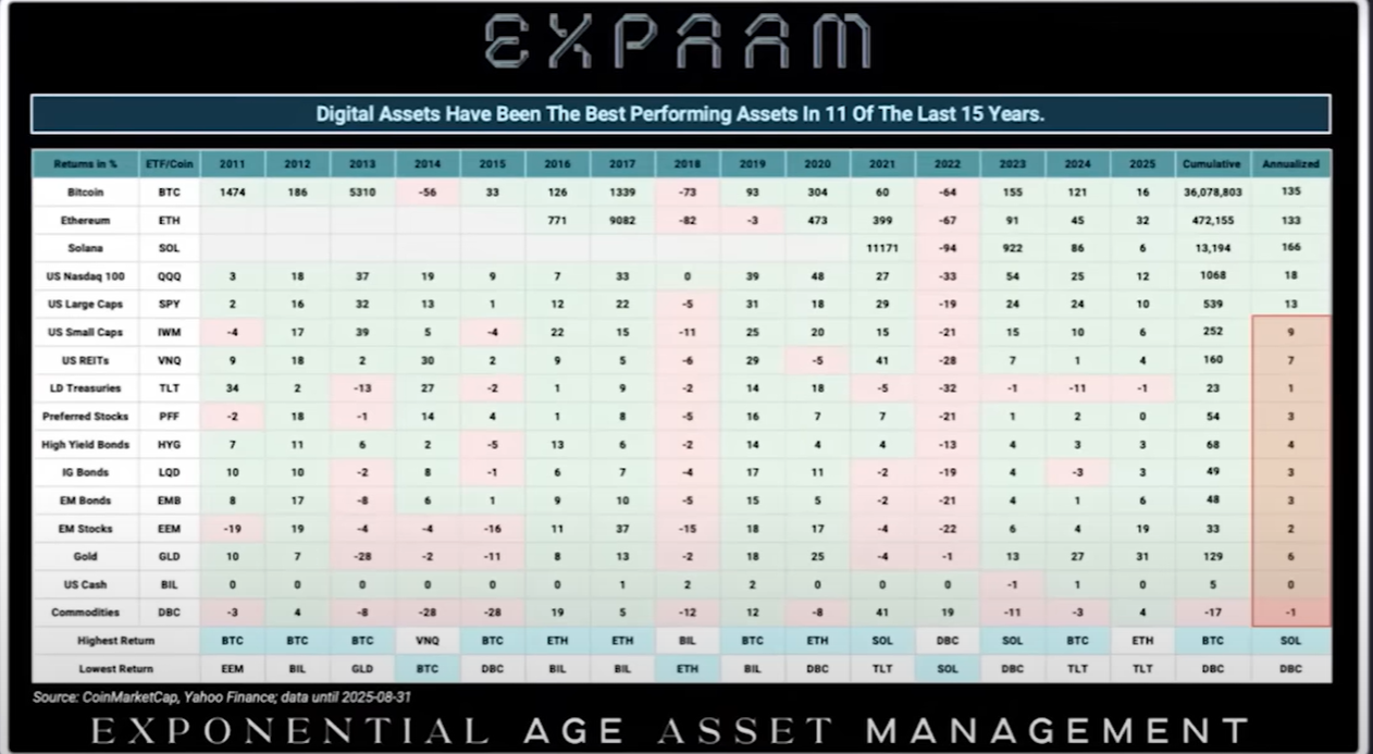 Pal said Bitcoin has delivered about 130% annual growth since 2012, even with major drawdowns of 64%, 73%, and 56%. Ethereum has compounded at roughly 133% per year and has consistently outperformed Bitcoin in past cycles.