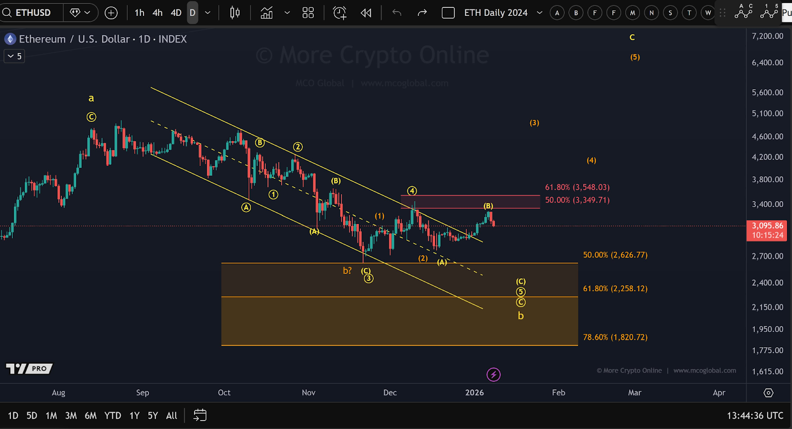 On the downside, Ethereum is holding above recent lows, but overall pressure remains tilted lower. If the price weakens further, analysts see room for Ethereum to drift toward the $2,600 to $2,250 range, where buying interest could return.