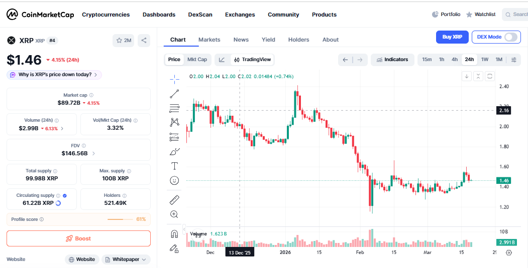 As of March 19, 2026, the XRP price is hovering around $1.46–$1.47, down 4% in the past 24-hours amid broader market fluctuations.