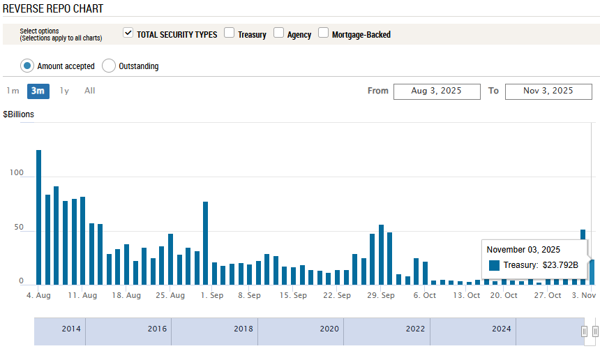 The U.S. Federal Reserve has injected $125 billion into the banking system over the past five days, its biggest short-term liquidity move since early 2020. The largest single-day injection, $29.4 billion, came on October 31 through overnight repo agreements, according to official Fed data.